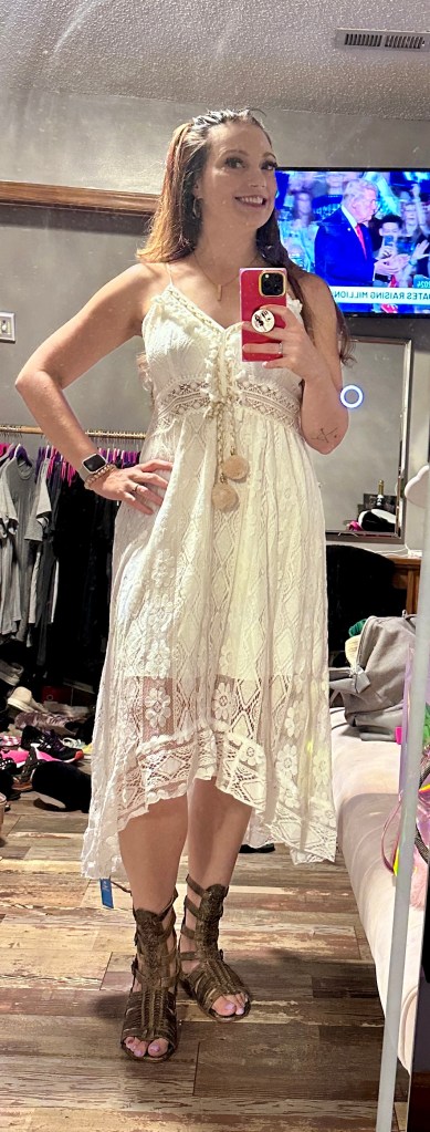 Now that I have chose the dress, shoes were the next thing to figure out. I was torn between cowboy boots I had that had gold details on them and these sandals that I had and ended up going with. I have had these for a couple of years and they are comfortable. Knowing there would be music and dancing, I chose the comfortable choice.