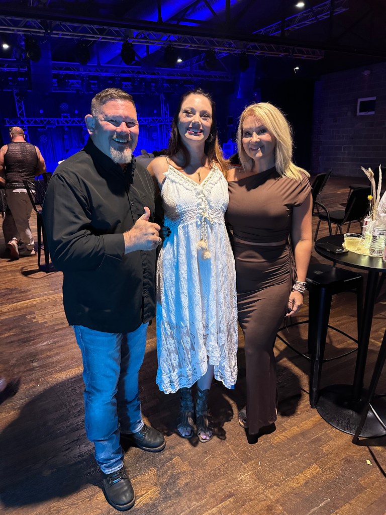 His black button up shirt with the sleeves rolled up, were complimented by the light colored jeans. Hubby pictured with myself and our friend Charity.
