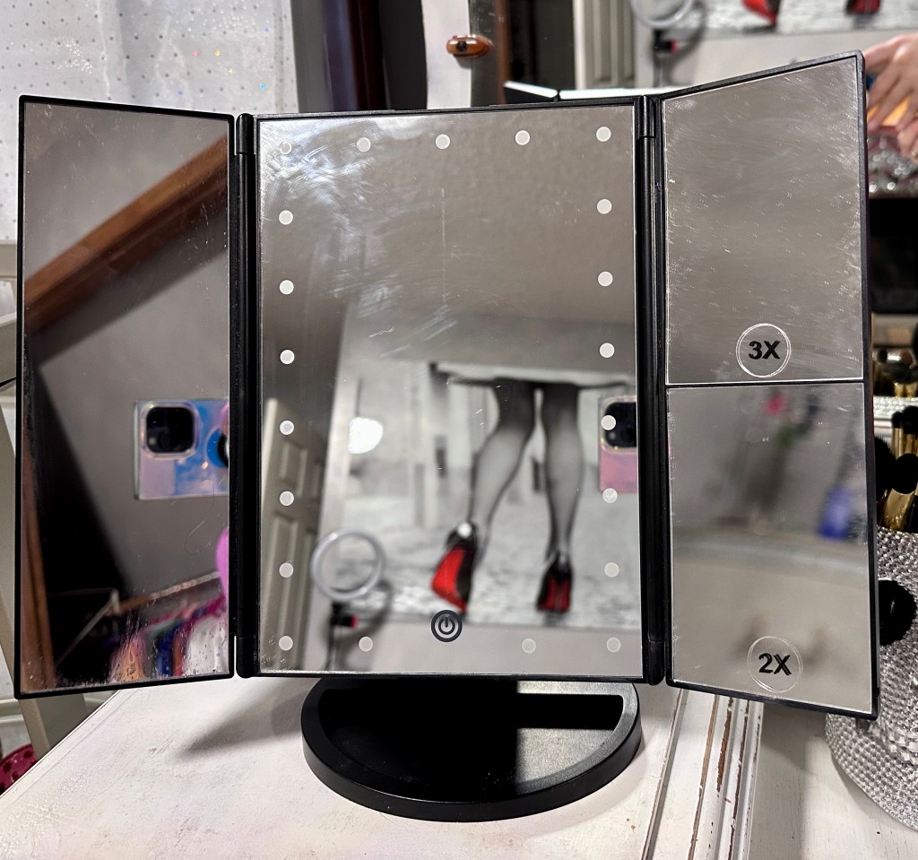 The magnification helps to see makeup creases or a hair that needs to be plucked.