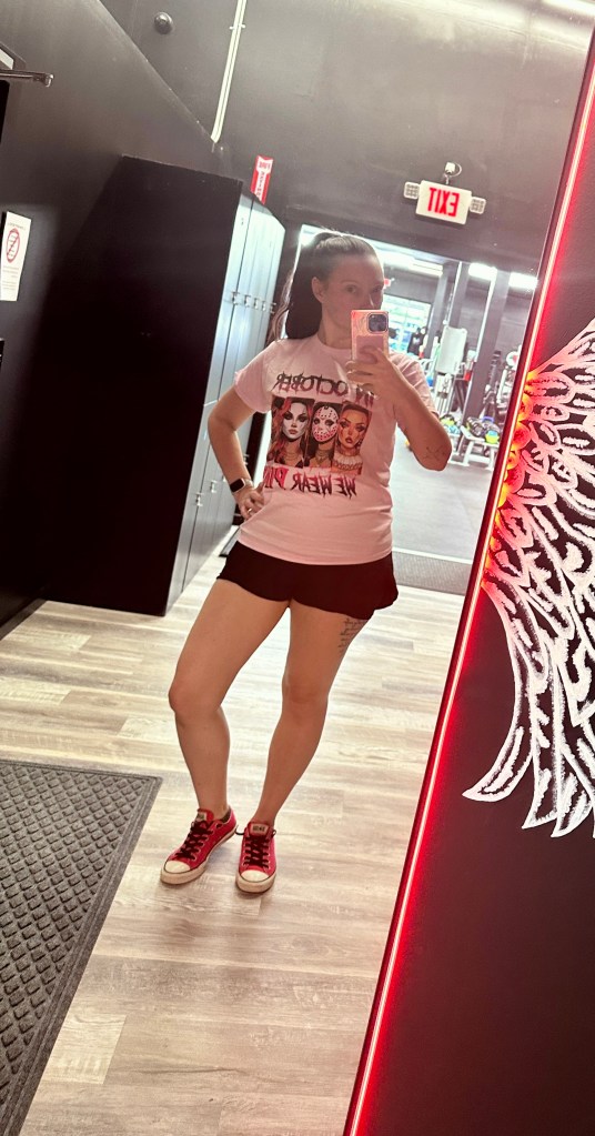The shirt is from the TikTok Shop and perfectly blends Mean Girls, spooky season, and breast cancer awareness. Breast cancer awareness is especially close to my heart. My aunt is currently in her second battle with breast cancer, and one of my dear friends earned her angel wings on Halloween last year after bravely fighting the disease until the very end.